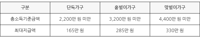- 전년도 가구원 구성에 따른 총소득기준 금액 미만